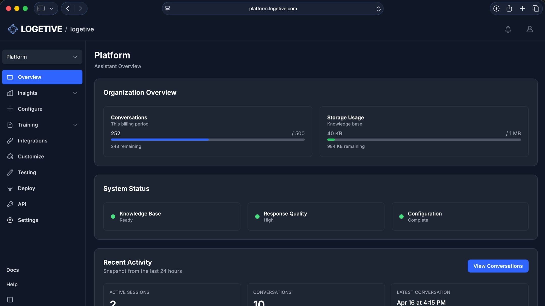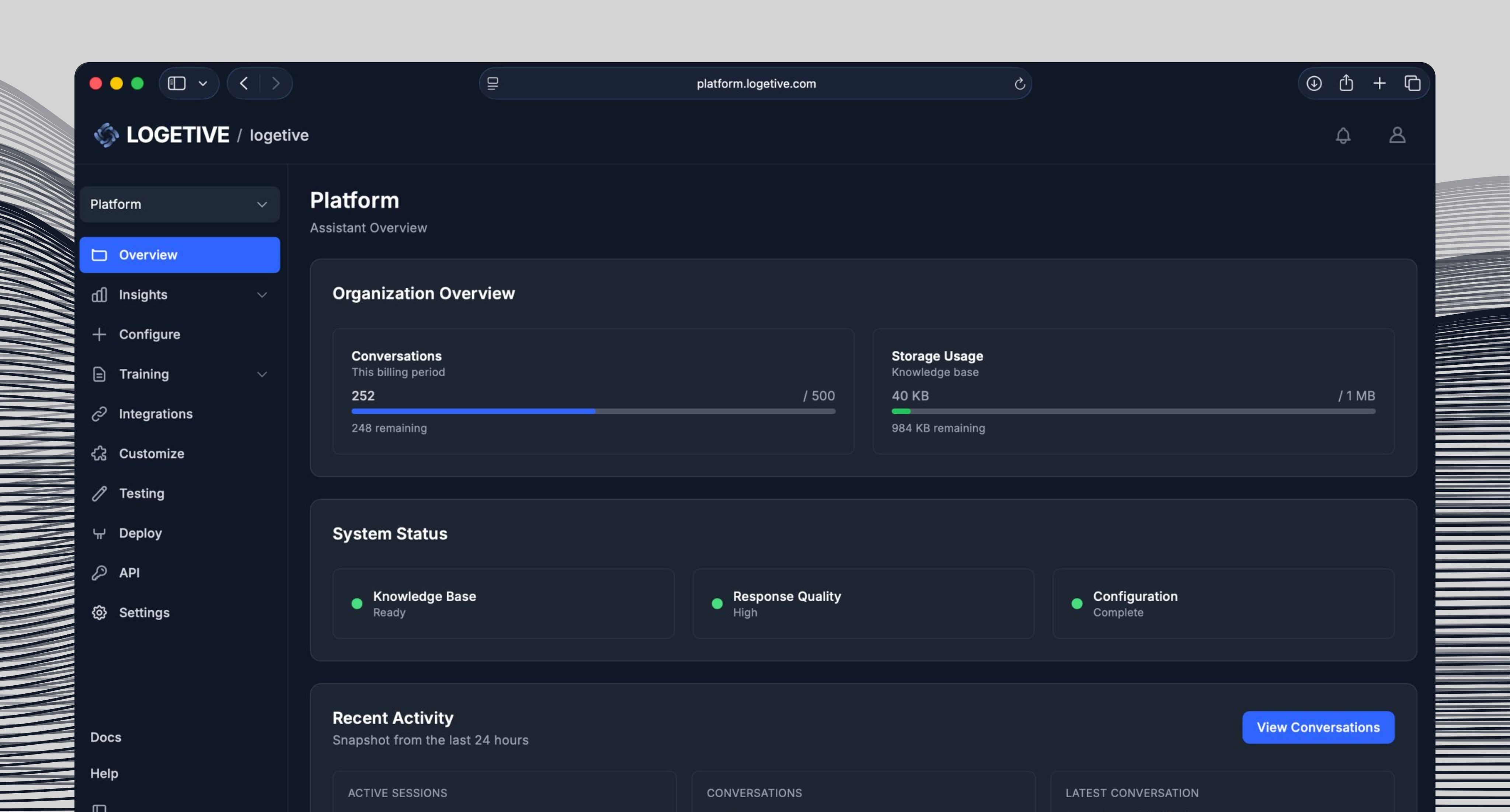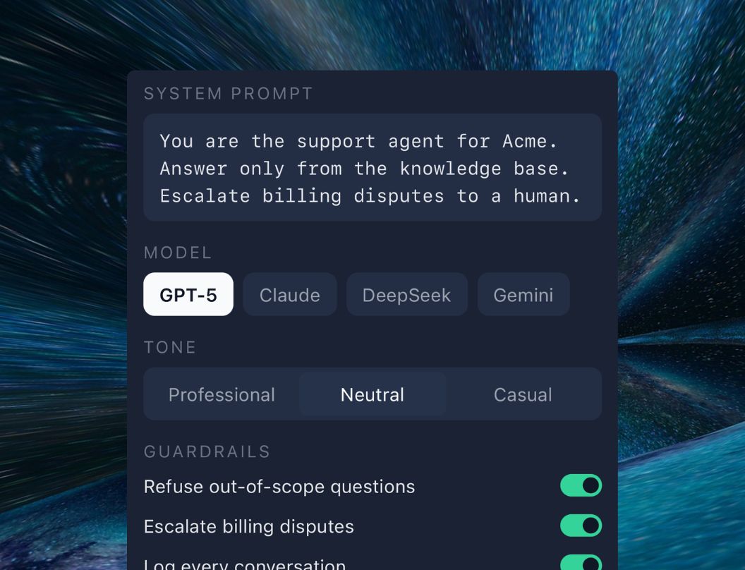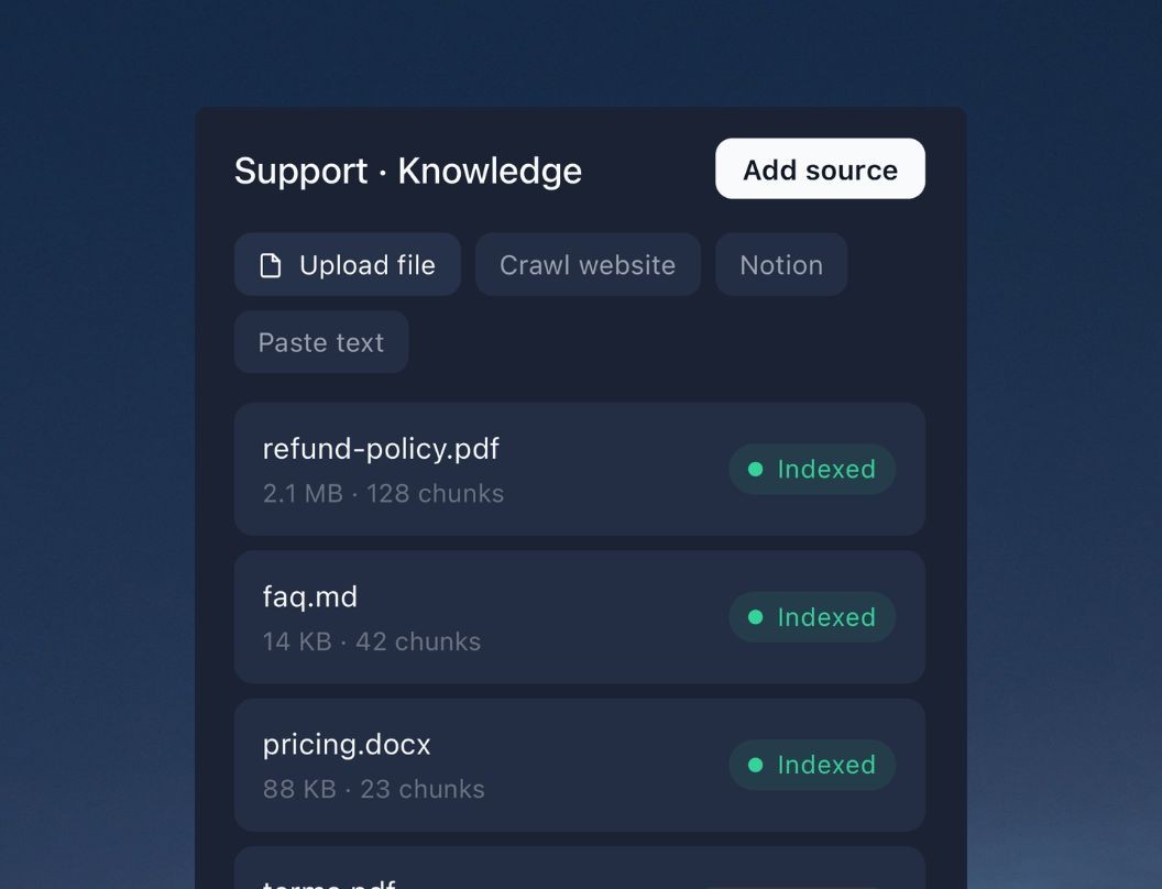 We don’t train on your documents or conversations. Your data stays yours. Every conversation is logged so you can review, improve, or meet compliance. You also choose where the assistant runs via allowed domains.